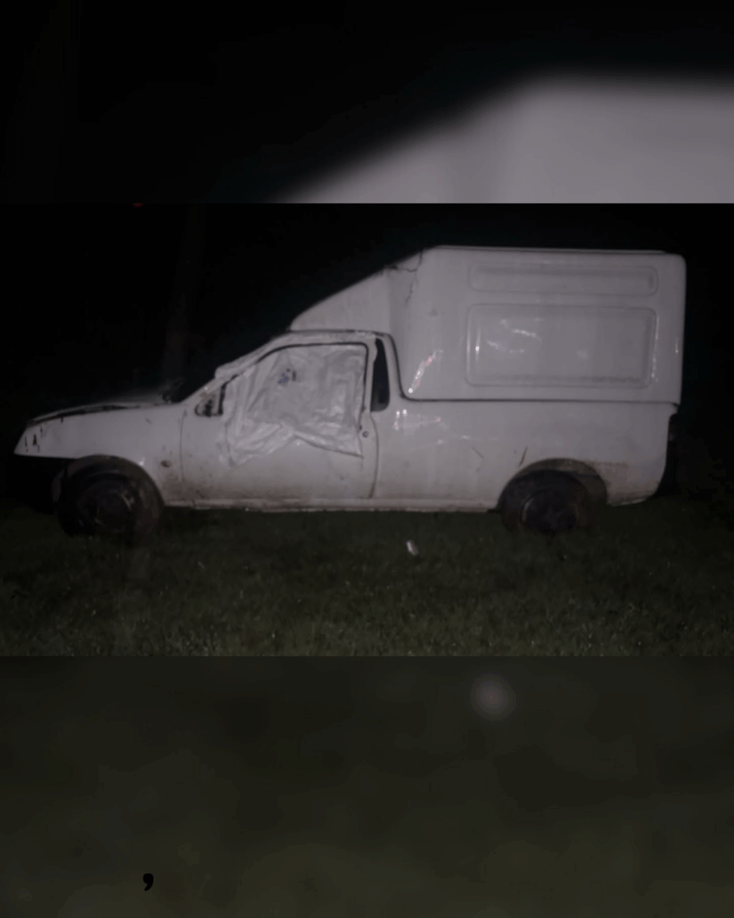Ao chegar ao local, os militares encontraram uma Ford Courier branca fora da pista, sobre o canteiro da rodovia. O automóvel havia colidido contra uma placa de sinalização após perder a trajetória e avançar para a área lateral. A estrutura metálica ficou danificada com o impacto.