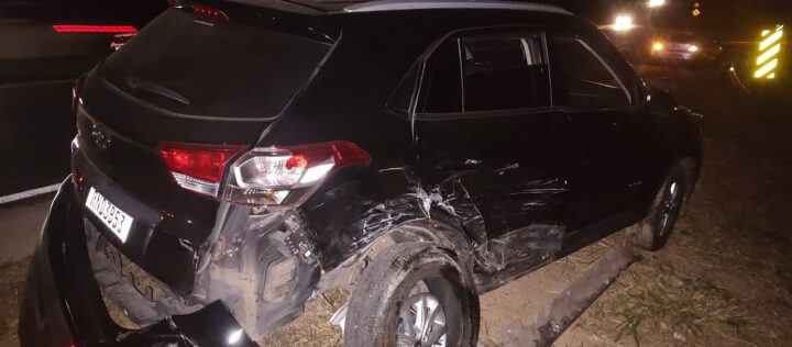 No entanto, logo atrás, um Toyota/Corolla não teve tempo hábil para frear, colidindo com a lateral traseira do Hyundai/Creta. Com o impacto, ambos os veículos saíram da pista. O Corolla capotou e se chocou com uma placa de sinalização.