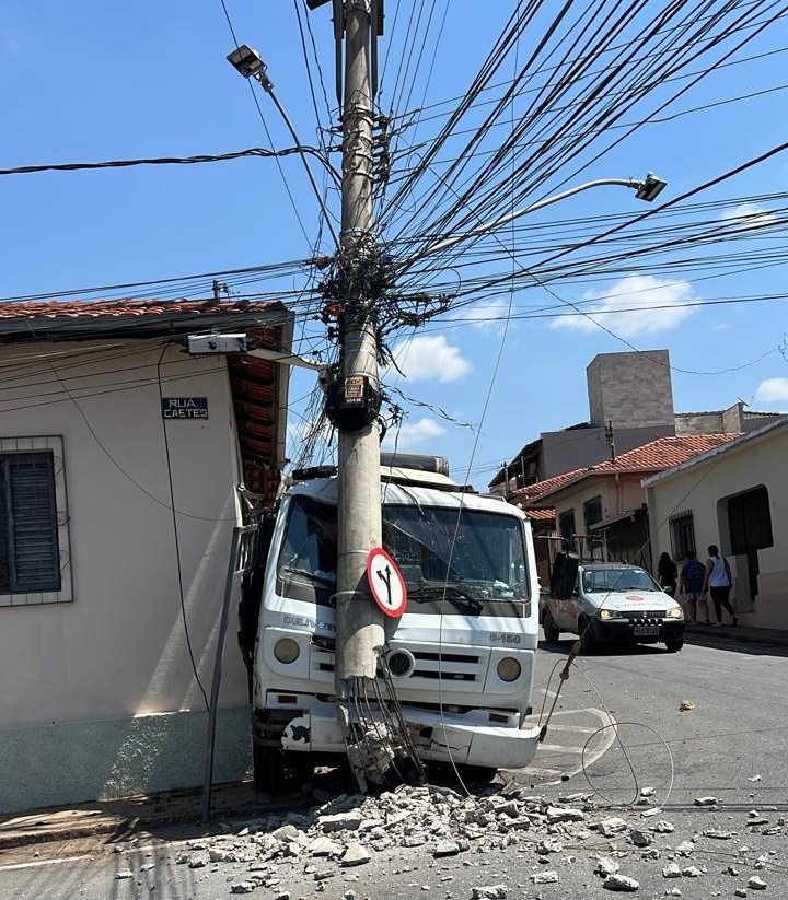 Um caminhão que transportava uma mini carregadeira colidiu contra um poste de energia elétrica no início da tarde desta segunda-feira, 8 de setembro de 2025, na rua Antônio Martins, esquina com a rua Caeté, no bairro Piedade, em Itaúna.