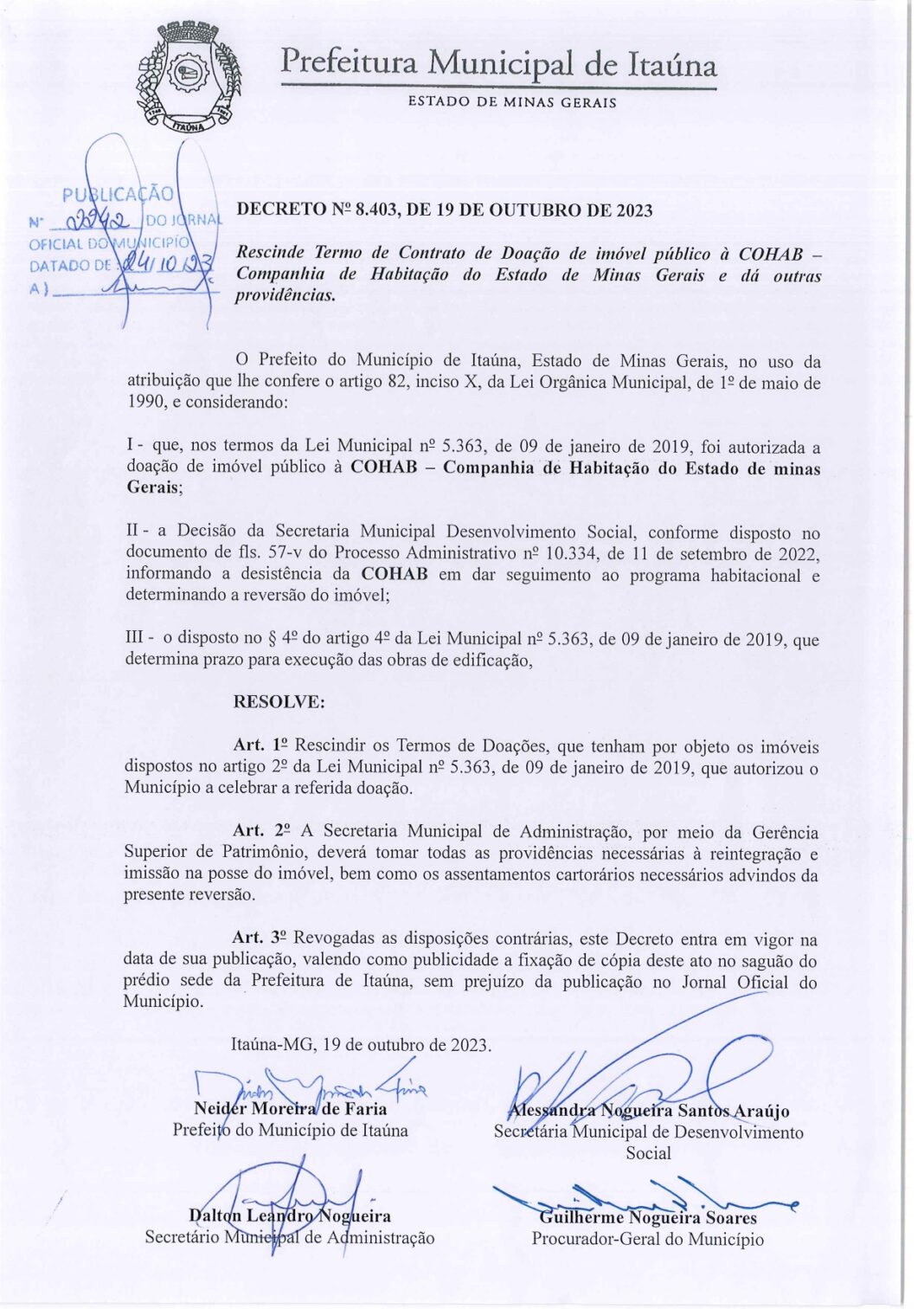 O acordo mencionado foi assinado em 24 de abril de 2017, durante a gestão do então prefeito Neider Moreira, em parceria com a Cohab/MG, presidida naquele período por Alessandro Marques. O protocolo previa a criação de condições para viabilizar, em curto prazo, a construção de moradias voltadas à população de baixa renda, dentro do programa Cohab Mais Perto.