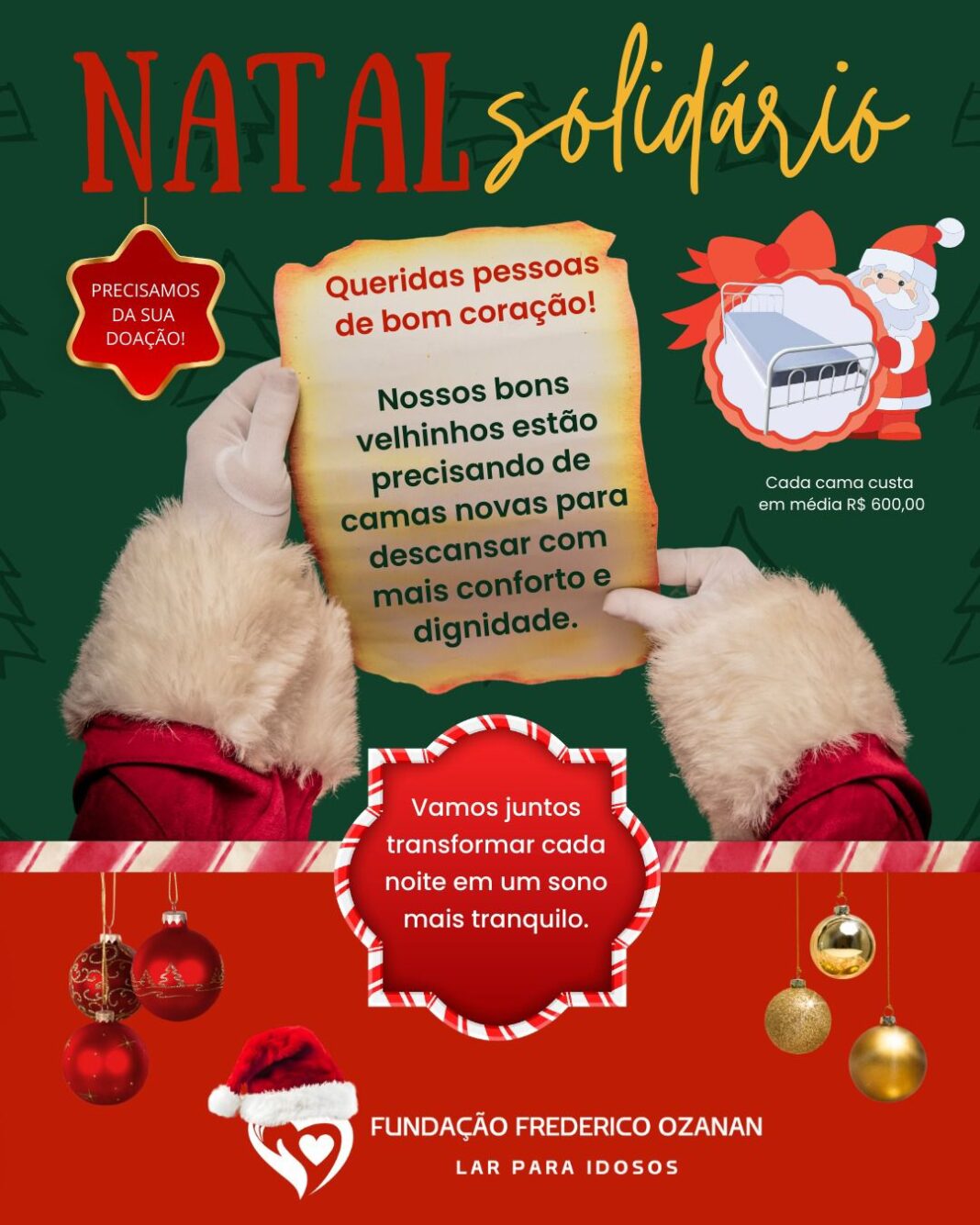 A Fundação Frederico Ozanan deu início a uma campanha de Natal mobilizando a comunidade para garantir mais dignidade e conforto aos moradores da instituição. O “Natal Solidário” visa arrecadar recursos para a compra de novas camas, uma vez que as atuais já não oferecem a estrutura necessária para um descanso adequado. Cada unidade custa, em média, R$ 600, valor que pode ser doado integralmente ou parcialmente por qualquer pessoa que desejar contribuir.