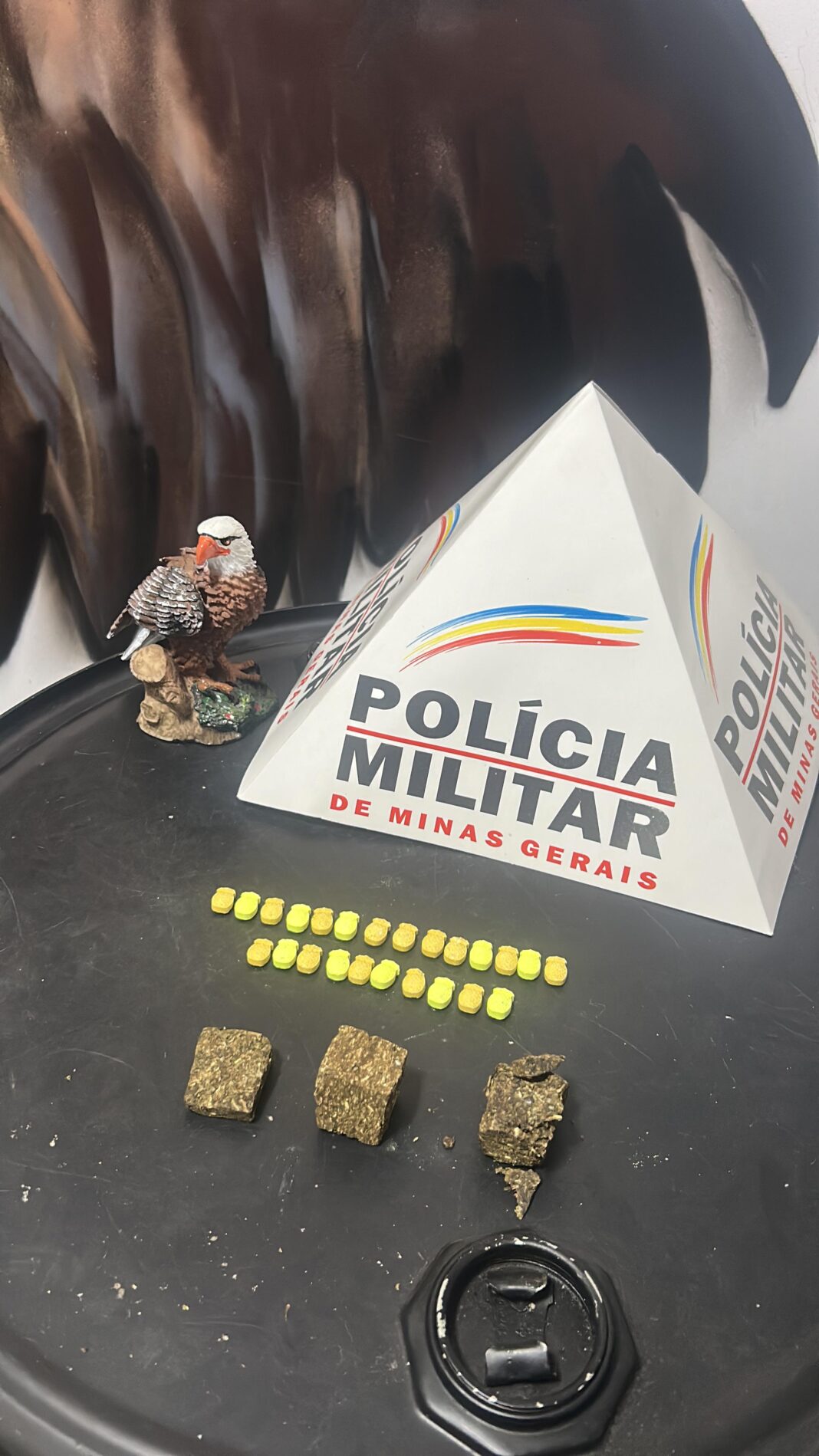 Durante buscas no local indicado, os militares localizaram 14 comprimidos de ecstasy e três tabletes de maconha. Em continuidade às diligências, a equipe se deslocou até a residência do autor, onde foram encontrados mais 10 comprimidos de ecstasy, totalizando 24 unidades da droga sintética.