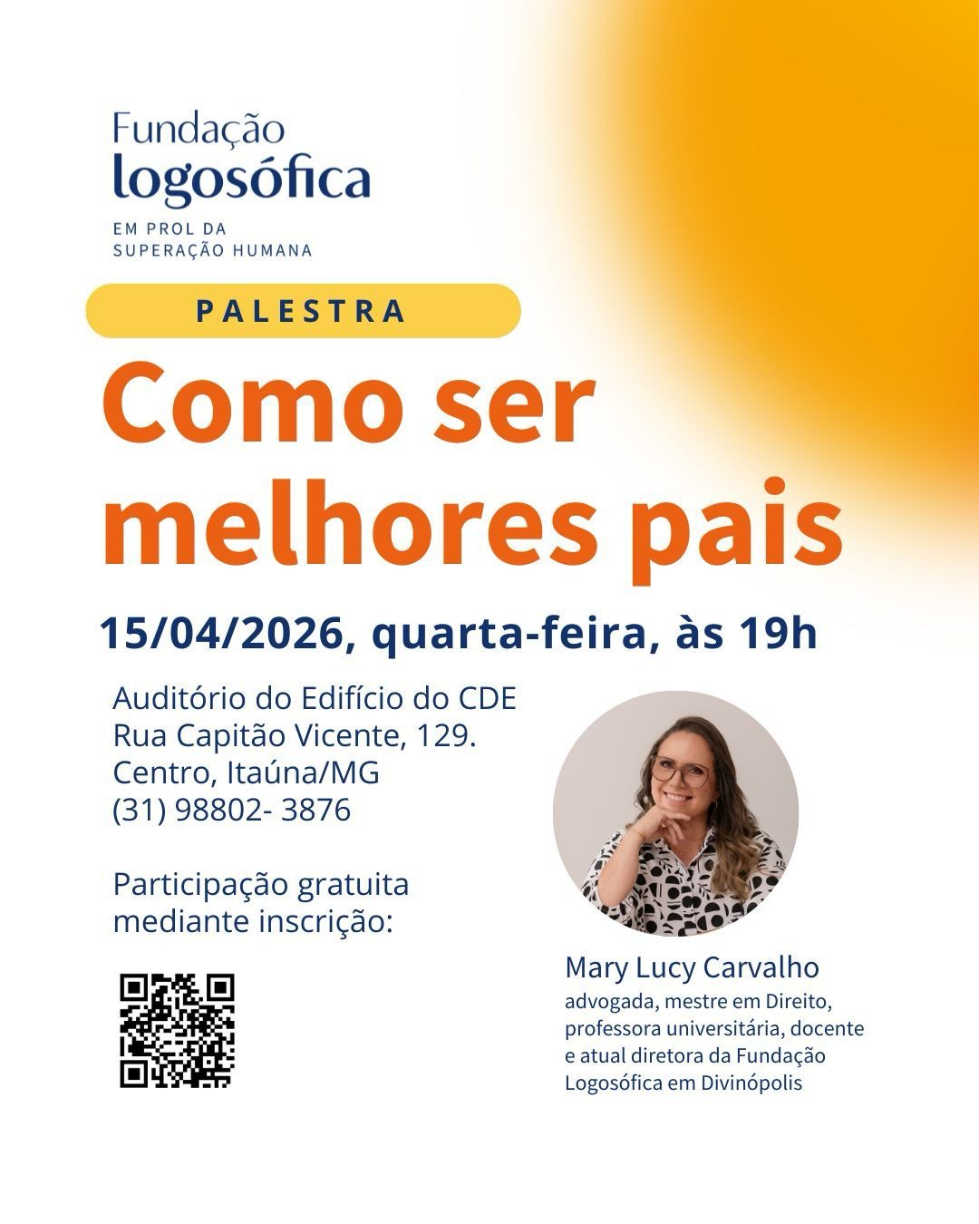 A Fundação Logosófica realiza nesta quarta-feira, 15 de abril, uma palestra gratuita em Itaúna com o tema “Como ser melhores pais”. O evento acontece às 19h, no auditório do Edifício do CDE, localizado na Rua Capitão Vicente, 129, no Centro.