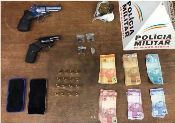 Dois homens foram presos em flagrante e duas armas de fogo, munições e drogas foram apreendidas pela Polícia Militar na madrugada dessa sexta-feira (5), em Itaúna, após denúncias de disparos em um baile funk clandestino. A ocorrência teve início por volta das 2h44, quando a PM foi acionada para atender a um chamado de disparos de arma de fogo na comunidade rural dos Lopes. A denúncia informava ainda que no local estava ocorrendo uma festa de funk com a presença de pessoas armadas e utilizando drogas. Durante o deslocamento para o local indicado, os militares abordaram uma VW Saveiro branca com som alto. Ao perceberem a aproximação da viatura, os ocupantes do veículo dispensaram um revólver calibre .38 pela janela. Em busca pessoal, um segundo revólver e munições de calibre .38 foram encontrados na cintura do motorista. Os dois ocupantes do veículo, um homem de 20 e outro de 21 anos, foram presos em flagrante por porte ilegal de arma de fogo. O veículo foi removido para o pátio do Detran. No local onde o baile funk acontecia, a polícia encontrou e apreendeu porções de maconha, haxixe e dinheiro. Um dos detidos, de 21 anos, já possuía histórico de ocorrências por ameaça, enquanto o homem de 20 anos já tinha passagens por tráfico de drogas.