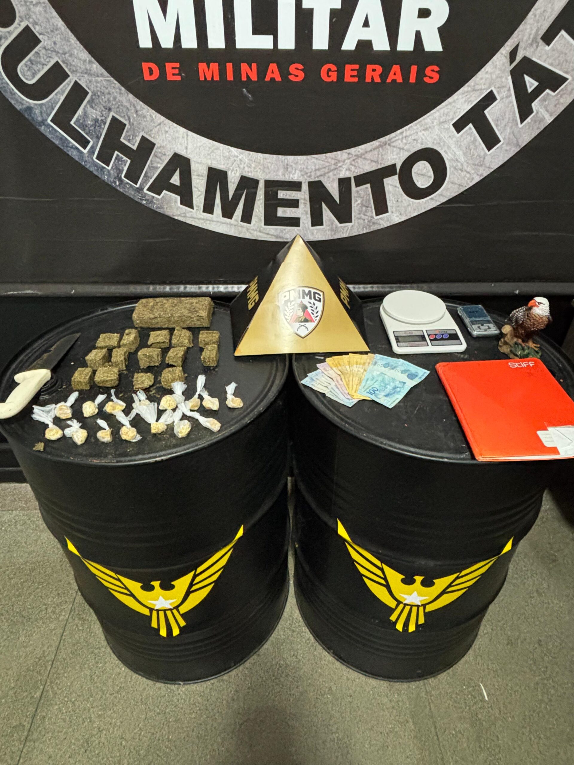 No interior do apartamento do suspeito, os policiais realizaram buscas e apreenderam diversos tabletes de maconha, uma barra grande da mesma substância, vários invólucros de crack, quantia em dinheiro, uma balança de precisão e um caderno contendo anotações relacionadas à contabilidade do tráfico.