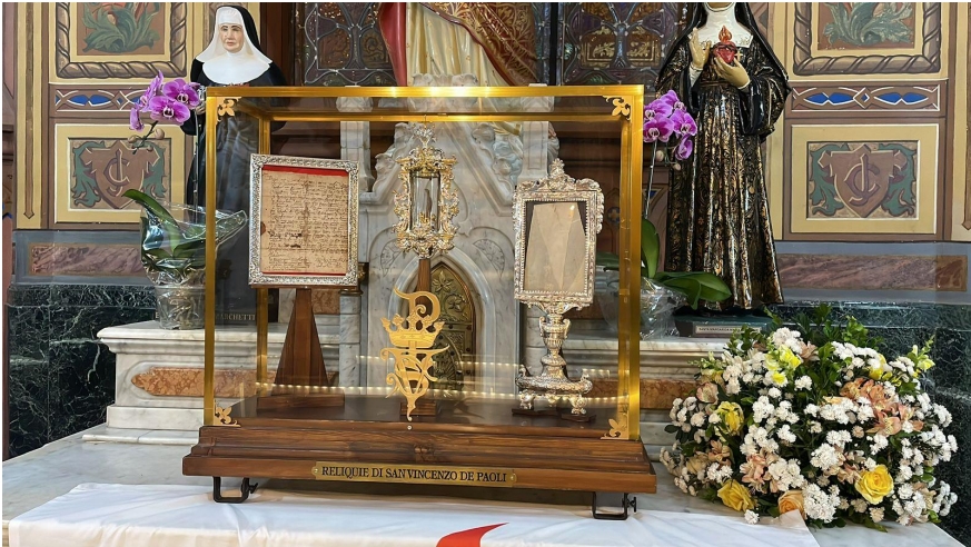 Entre os objetos de veneração que acompanham a peregrinação estão relíquias consideradas de grande valor histórico e espiritual: um fragmento da costela do santo, classificado como relíquia de primeiro grau; partes de sua túnica litúrgica e uma carta escrita por São Vicente a Santa Luísa de Marillac, ambas de segundo grau. Também integra a exposição uma réplica em cera de seu corpo, em tamanho real, que possibilita aos fiéis uma experiência simbólica de maior proximidade com o santo.