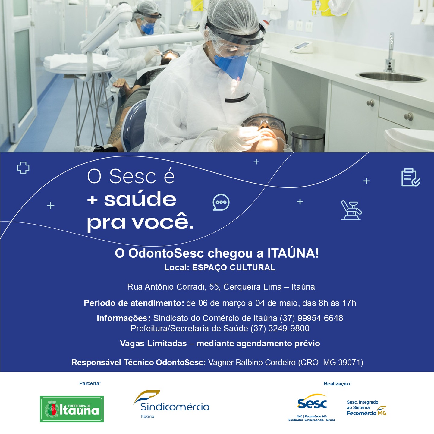 A realização do Odonto Sesc em Itaúna é do Sistema Fecomércio MG, por meio do Sesc em Minas, em parceria com o Sindicomércio Itaúna e a Prefeitura Municipal.