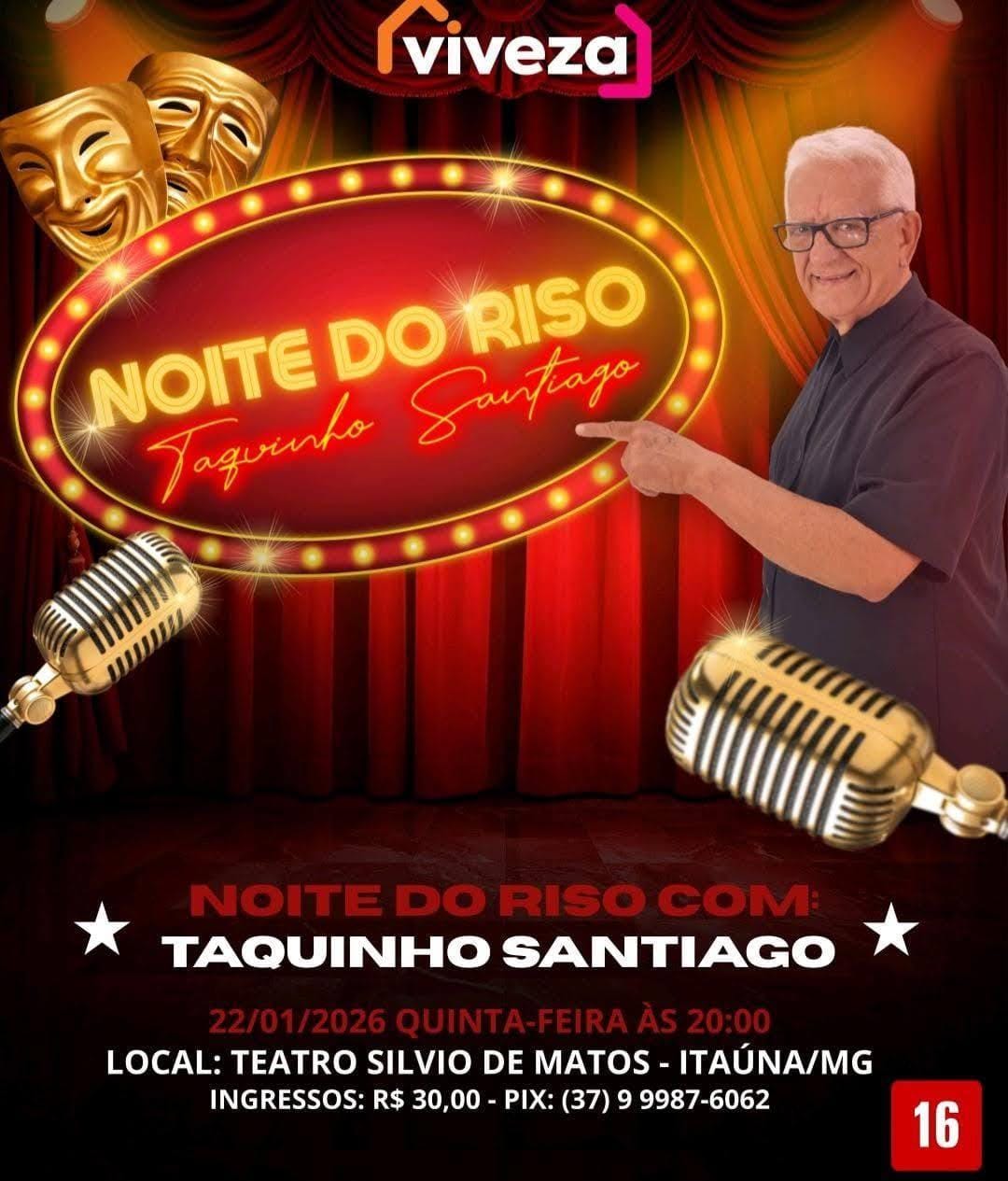 Conhecido por seu estilo espontâneo e pela forte conexão com a plateia, Taquinho Santiago leva ao palco situações comuns do dia a dia, observações bem-humoradas e experiências pessoais transformadas em comédia. O resultado é um espetáculo dinâmico, que aposta na identificação do público e no riso fácil, sem apelos exagerados.