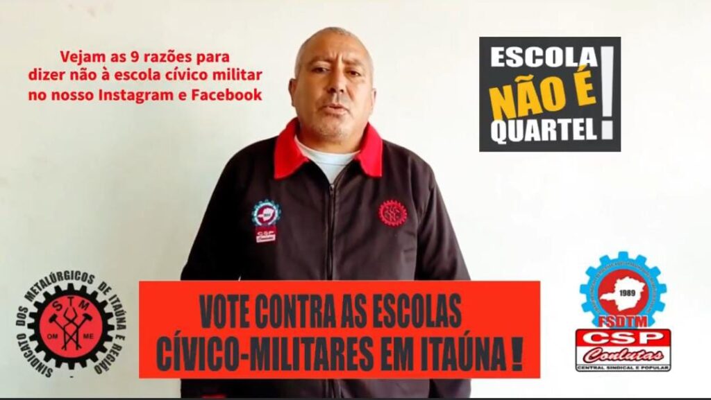 O Sindicato dos Metalúrgicos de Itaúna se posicionou contra a implementação do modelo cívico-militar e, em vídeo divulgado nas redes sociais, o diretor Marcelo Noel criticou a presença de militares nas unidades de ensino e apontou motivação política na proposta. “Esse projeto visa a questão eleitoral do governo Zema, que quer abocanhar os ex-eleitores de Bolsonaro com esse projeto”.