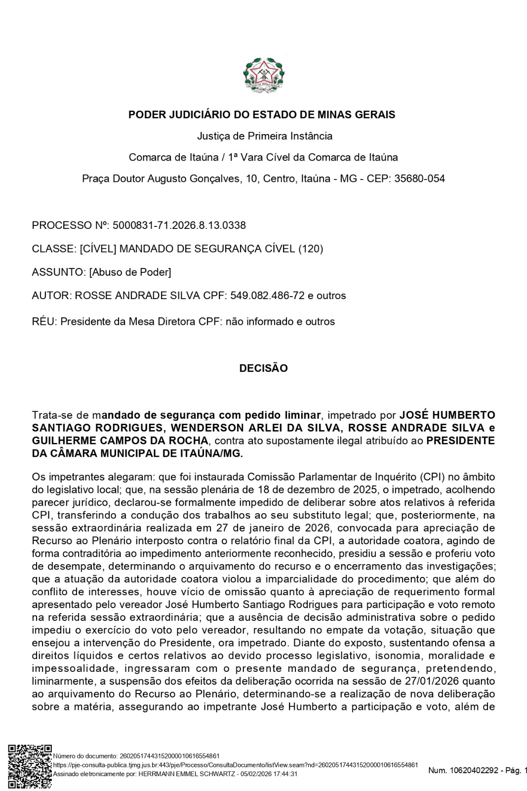 A Justiça concedeu liminar em mandado de segurança impetrado pelos vereadores José Humberto Santiago Rodrigues, Wenderson Arlei da Silva, Rosse Andrade Silva e Guilherme Campos da Rocha contra ato do presidente da Câmara Municipal de Itaúna. A decisão determina a suspensão dos efeitos da sessão extraordinária realizada em 27 de janeiro de 2026, que havia arquivado o recurso relacionado à CPI da comunicação.