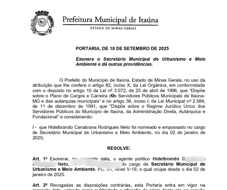 A Prefeitura Municipal de Itaúna vem a público esclarecer, diante das recentes notícias veiculadas na mídia, envolvendo o nome do vice-prefeito e Secretário Municipal de Meio Ambiente, Sr. Hidelbrando Canabrava Rodrigues Neto, que os fatos noticiados não guardam qualquer relação com o exercício de suas funções públicas municipais, seja como vice-prefeito, seja como titular da referida pasta.